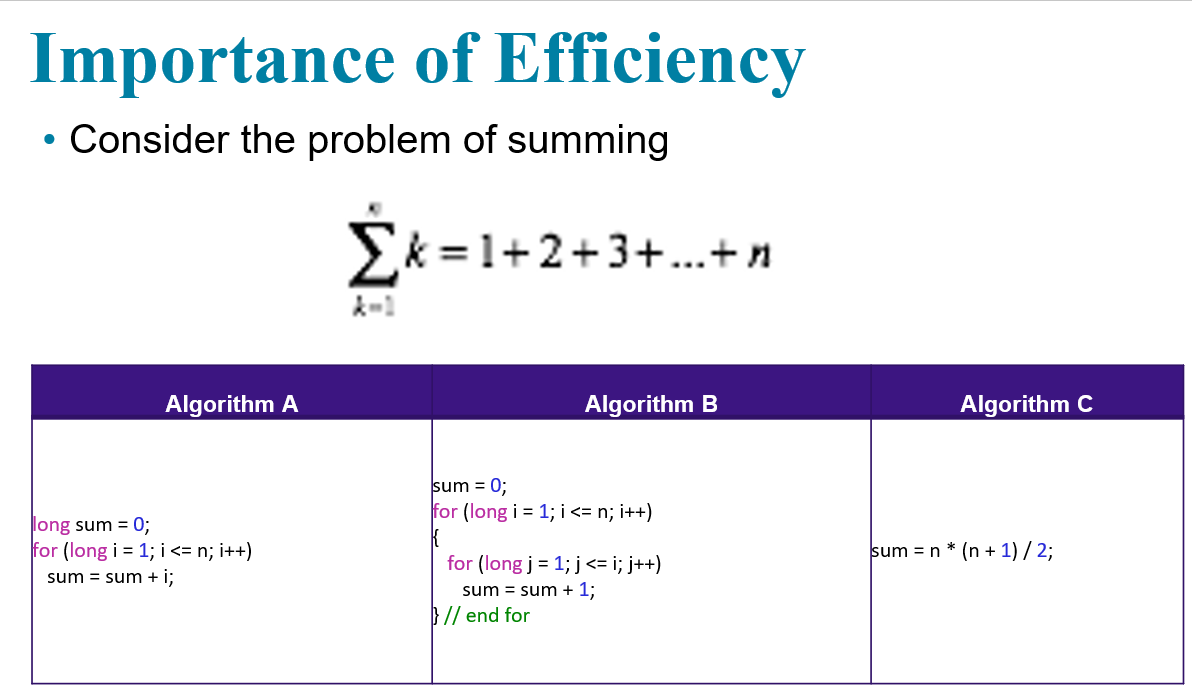 This week your task is to write a program that tests or "profiles" three different algorithms that compute the sum of all positive integers from 1 up to a value input at the command line. The three algorithms are those shown as algorithms A, B and C in this image.